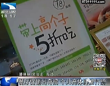 “带上高个子,吃饭打五折”,这是武汉市街道口某餐厅打出的促销口号。男生身高1米78以上,女生身高1米68以上即可打折,个子越高, 折扣越多,五折封顶。