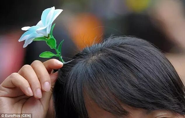 据人民网报道,这款新奇发饰老少通吃,有近百种不同设计,其中不少都是塑料花,远看像从头顶上发芽长出的植物,近看更像天线。