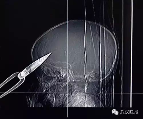 10月10日午,南京市儿童医院急诊接到来自苏北某县的患儿,患儿的头部插了一把剪刀!