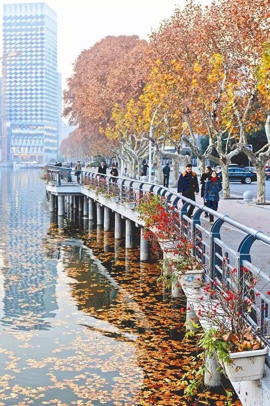 秋风吹来,有金色的树叶在空中跳舞,游客和行人可以漫步在水果湖畔的木质走廊上,于眺望东湖美景之余,欣赏法桐之美。