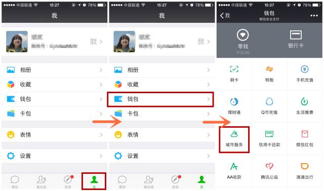 打开微信进入“我”→戳“钱包”→再戳"城市服务"