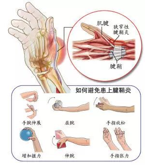 平时还可常做手指保健操:伸开五指再并拢、双手互相揉捏、旋转手腕等方式都可以有效预防腱鞘炎。