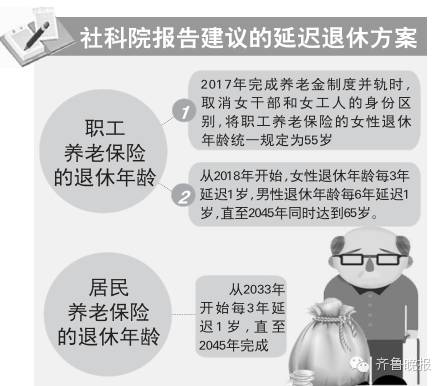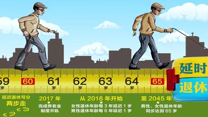 2017年完成养老金制度并轨, 从2018年开始, 女性退休年龄每3年延迟1岁, 男性退休年龄每6年延迟1岁, 至2045年男性、 女性退休年龄同步达到65岁。