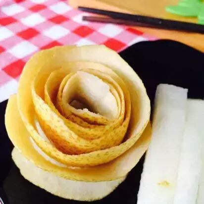 把苹果皮连小块果肉削下,滴上少许蜂蜜,敷在嘴唇上即可。