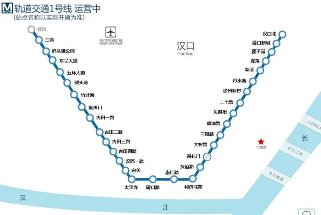 武汉轨道交通1号线为地铁高架线。位于武汉市长江及汉江以北的汉口地区,贯穿东西湖、硚口、江汉、江岸、黄陂五区。共设站32站。