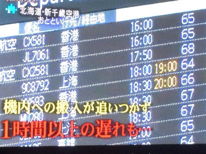 电视台的记者跑到北海道新千岁机场采访,说中国旅游团的行李堆成了山,而进入机场后,游客又大包小包地购买,结果客机上根本放不下乘客这么多手提行李,为了让大家能够带走这些行李,乘务员不得不打开客舱与货舱之间的秘密通道,把大件的购物袋统统放到货舱里,为此,多个飞中国的航班延误,有的延误时间长达一个多小时。