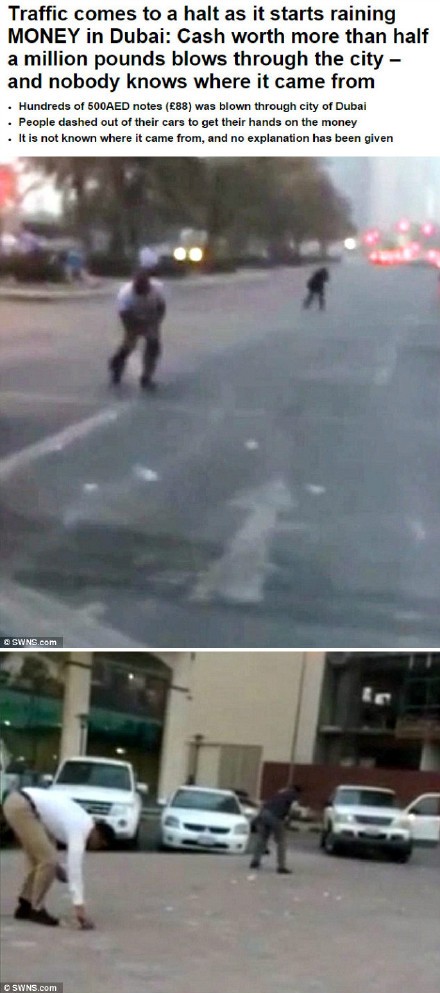 接下来是喜闻乐见的#致富信息#栏目。有时候,想致富,只需要简单的买一张机票,然后飞到迪拜去就好了。前几天的一个下午,迪拜街头突然从天空开始飘下无数的钱!每张都是500迪拉姆(大概550人民币) 的全新的纸币。 预计当时整个天上大概飘着价值50万美元的迪拉姆纸币,没有人知道是这都是从哪刮来的,也没人知道这是不是哪个土豪撒的,总之,迪拜就是这么任性。