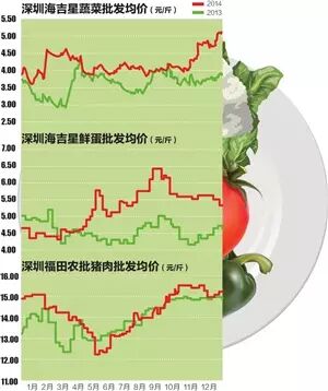 昨日,记者从深圳多家农批市场和农贸市场了解到,2014年深圳蔬菜、鸡蛋、水果、淡水鱼批发价格明显高于前年,猪肉的批发价格则与2013年价格行情走势极为类似。据中农数据统计,深圳食品类CPI(居民消费价格指数)与前年相比,均走出一波同比继续小幅温和上涨而环比起伏波动的涨跌趋势。