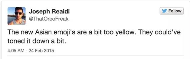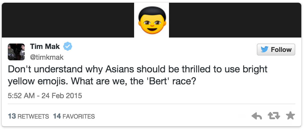 首先是不少亚裔在推特上吐槽,凭什么用这样屎黄屎黄的颜色代表我们黄种人啊?设计师你给我来中国找一个长这样的人出来?以为我们都长得和芝麻街似的?