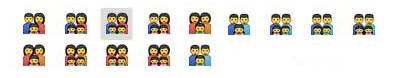除了肤色,苹果还增加了很多不同性取向人士组成的不同类型的家庭图标。下图是目前使用的家庭图标,可以看到除了上一版本增加的两男组合和两女组合外,带小孩的图标只有“一男一女带一个男孩”一种。
