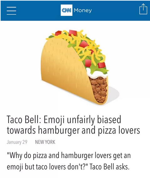 还有一个最不可思议的家伙也加入了战团,那就是美国的墨西哥风味连锁快餐店Taco Bell。他们质问,为什么食物图标里有汉堡、披萨、薯条,却没有我们墨西哥风味的玉米卷?这不是赤裸裸的歧视玉米卷爱好者吗?