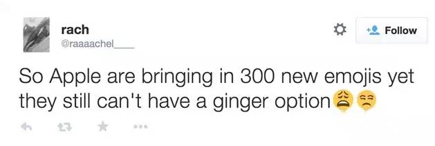 接下来又有人开始抱怨,为什么只有黑发、金发和棕发,而没有最独特的红发 (ginger)?