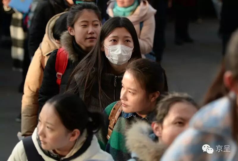 在长长的候考队伍中,总有很大比例的考生带着口罩,只露半边脸,让人好奇庐山真面目。