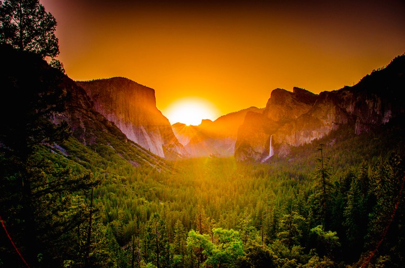 不可错过的壮美日出,整个山谷中不同的观景角度各有千秋。如果想赖床而又想看绝美日出,可以去Yosemite Lodge不远的Sentinel Bridge,横跨Merced River,就可以看着红日从Half Dome的圆顶冉冉升起,倒映在脚下的湖面中,如此美的景色要记得拍照留念哦。