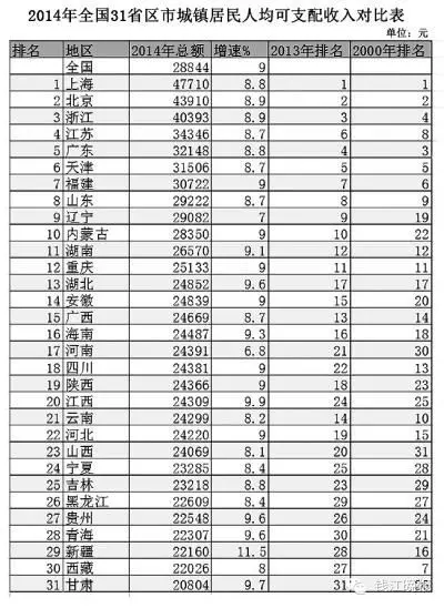 ▲2014年沪京浙深等省市的城镇居民人均收入都超过4万元,上海达47710元,从东中西看,收入差距依然显着