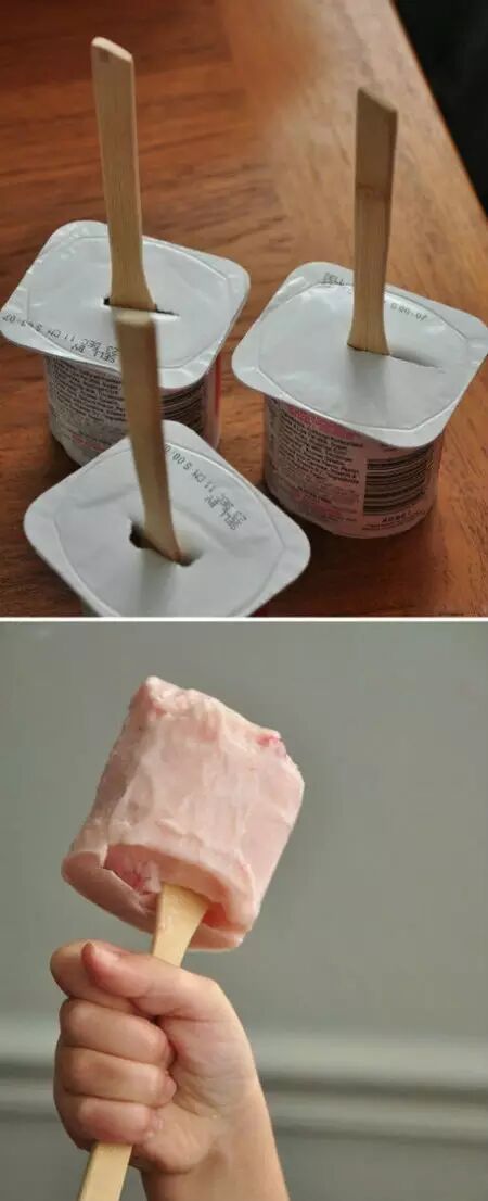 盒装酸奶顶部开小口,插入冰棒棍儿放冰箱冷冻室冻硬,吃的时候撕掉表面封口抽出来即可!