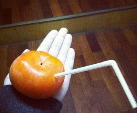 教你如何优雅地吃柿子:嗨,我这柿子,全托这根吸管的福了!以前呐,为了吃它,指酸,背痛,手抽筋儿,还出虚汗,自从用了这根管子,嘿!您猜怎么着?妈妈再也不用担心我弄得一手汁啦!吃货们,学会了吗?