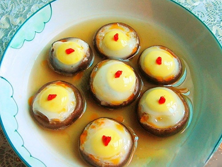 磨菇蛋:1. 将磨菇去帝,冼净待用。2. 将冼好的磨菇摆碗中,3. 备一些鹌鹑蛋待用。4. 每个磨菇里面打进一个鹌鹑蛋, 在摆好盘的麻菇蛋上撒上一些精盐。5. 再放进蒸锅里蒸10分钟,6. 再放进蒸锅里蒸10分钟。7. 蒸熟的磨菇蛋。8. 蒸熟的麻菇蛋上桌配上调汁蘸汁吃。