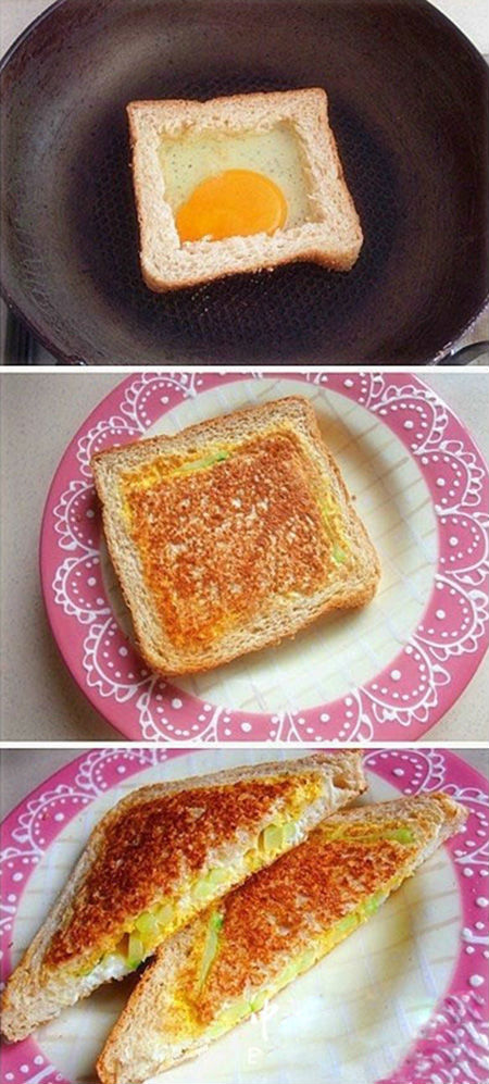 把面包中间切掉,打入蛋,等稍微凝固一些了加入你要的东西(比如黄瓜,芝士片 火腿或者培根)看鸡蛋差不多了盖上切下来的面包,翻过来再烘烤一下,浇上番茄酱切开即可。