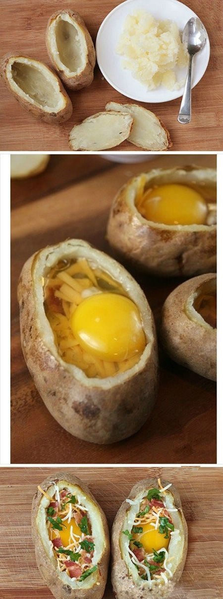 把土豆洗净蒸熟,挖空后塞点喜欢的蔬菜培根奶酪条什么的,打入一个鸡蛋,再放入烤箱烤熟。美味极了!