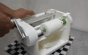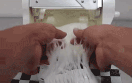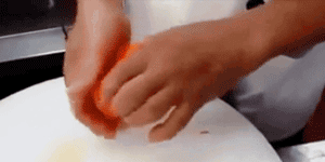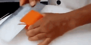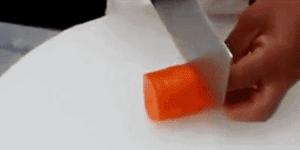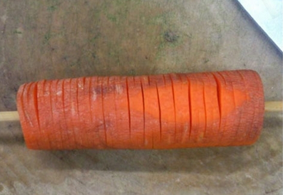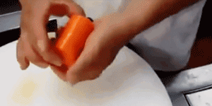就是从上下两个方向切,但是不要切断,大概切到差一厘米到胡萝卜中心,然后把萝卜转 90°,按照同样的方法切,和蓑衣黄瓜差不多,但是是交叉的。