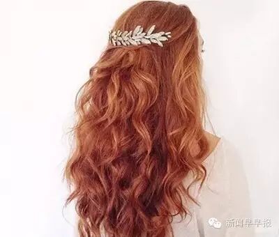 对于及腰的长发,弄个蓬松卷发,再扎个公主头,瞬间气质大不同,树叶形状的发饰遮住编发痕迹,唯美浪漫。