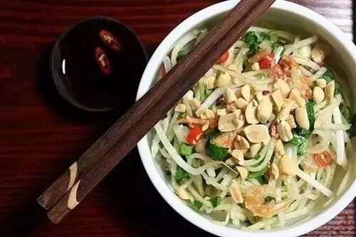 制作这种泰国最有名的沙拉,要先将大蒜和辣椒用杵臼捣烂,然后加入罗望子汁、鱼酱、花生、干虾、西红柿、柠檬汁、甘蔗糊、四季豆和少量磨碎的青木瓜。配着糯米饭一起吃。