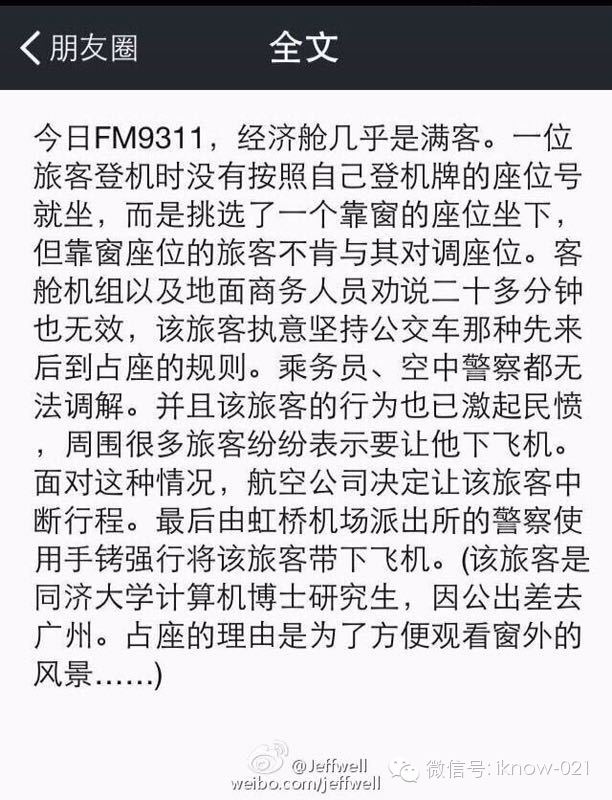 此外,曝料网友表示,男子最后被民警带下飞机,并称男子为沪上某知名大学博士研究生、因公出差去广州,”占座的理由是为了方便观看窗外的风景。“