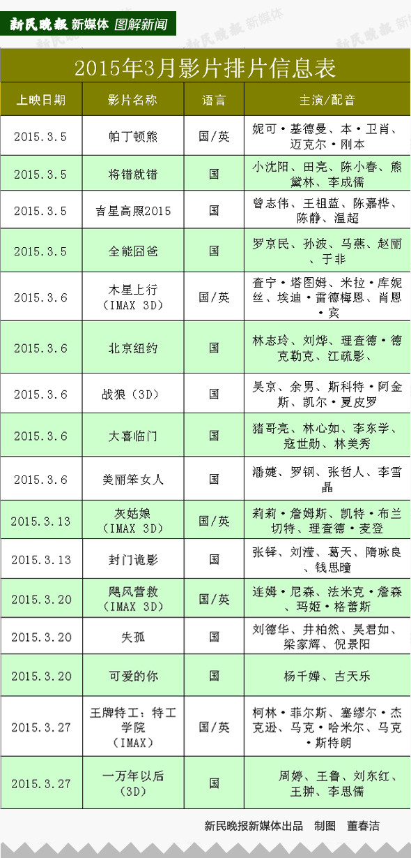 本该是淡季的三月影市,却多了不少进口片的身影,在3月引进片打头阵的是真人+动画电影《帕丁顿熊》,元宵节迎来美国科幻大片《木星上行》、3月中旬也有根据童话改编奇幻电影《灰姑娘》公映,一周之后着名动作系列最新作《飓风营救3》也会打出天下。最终,3月底还有《王牌特工:特工学院》作为收尾,3月份的引进片真可谓是来势汹汹。