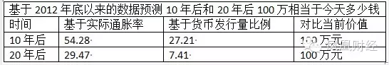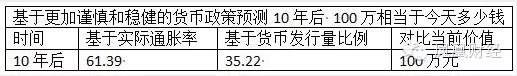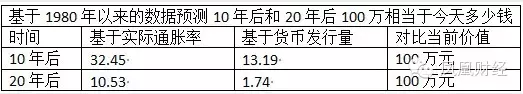 如果按照占货币发行量的比例计算,现在的100万元,在10年之后的财富比例可能相当于今天的13万元到35万元之间;20年后的财富比例可能相当于今天的2万元到19万元之间。