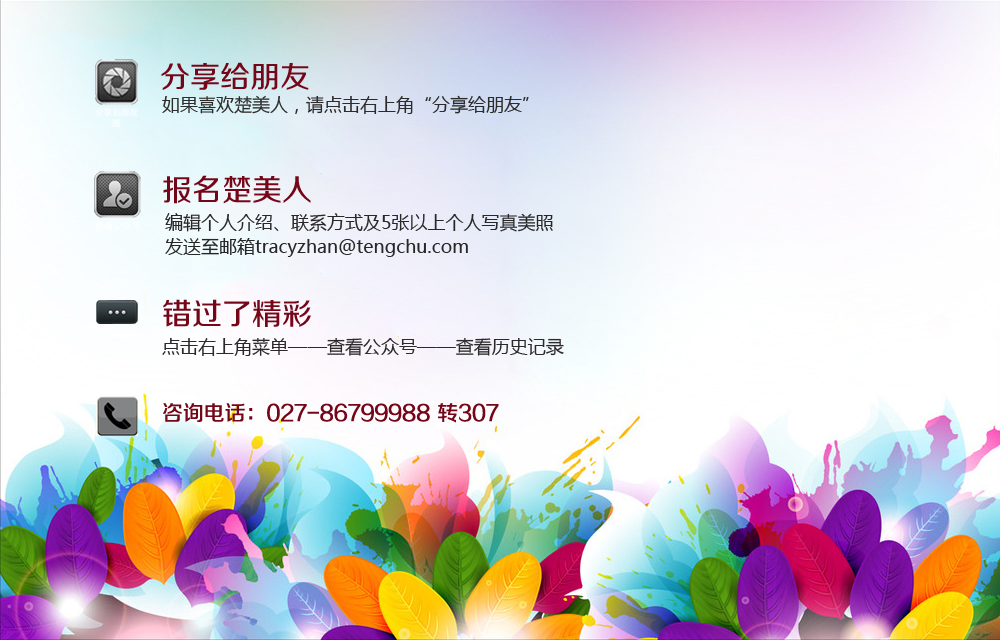 楚美人致力于打造华中地区最大美女写真输出平台,编辑个人介绍、联系方式及5张以上个人写真美照,发送至邮箱tracyzhan@tengchu.com即可参与报名。同时也欢迎关注腾讯?大楚网楚美人写真首发平台,获取摄影师最新作品和活动资讯。