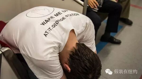 这件T延衫的背面上写着“Wake me up at St. George Station (请在圣乔治站叫醒我)”。穿着这件衣服在地铁上打瞌睡时,旁边好心的乘客就会知道,到了多伦多大学所在的圣乔治城站应该举起手,在这个可怜的缺觉的孩子背上,duang一下,拍醒他。