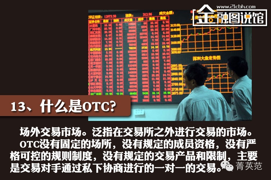 场外交易市场,又称柜台交易市场。泛指在交易所之外进行交易的市场。OTC没有固定的场所,没有规定的成员资格,没有严格可控的规则制度,没有规定的交易产品和限制,主要是交易对手通过私下协商进行的一对一的交易。
