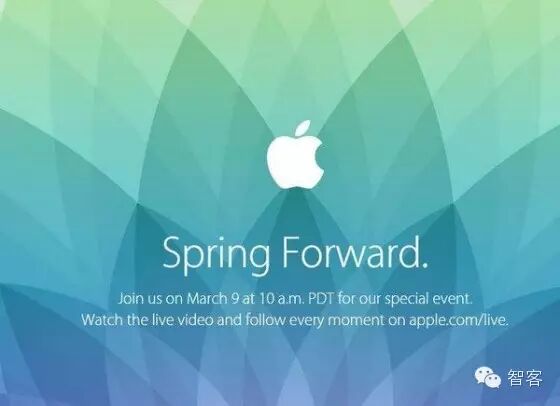 苹果发出的邀请函中只有简单的两个单词:“spring forward”,指春天美国进入夏时制时应把表调快,双关含义则是“跳跃前进”。(上图为苹果邀请函)