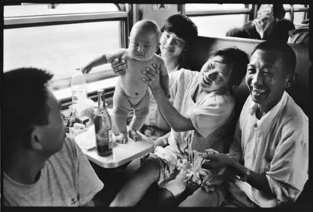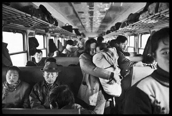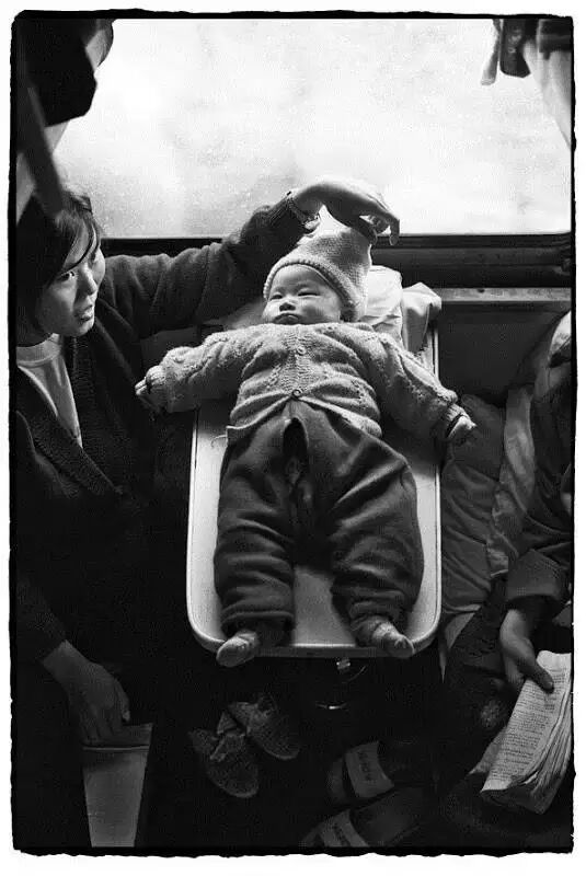 1991年,从绥芬河开往哈尔滨的列车上,在拥挤的车厢内,一位抱孩子的父亲脸上显露出困倦的神情,但依然紧抱孩子。