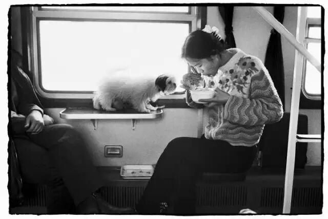 1995年,从齐齐哈尔开往北京的列车上,在宠物狗旁吃方便面的女青年。