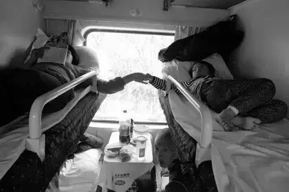 2010年,上海到哈尔滨的列车上,上铺的母亲一边看书一边拉着女儿的手。