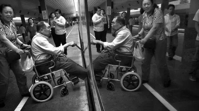 2007年,上海到北京的列车,一位坐着轮椅的老人在亲人的帮助下上火车。
