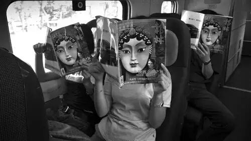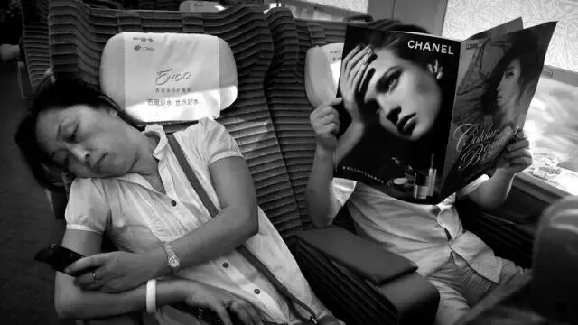 2007年,北京到哈尔滨的列车上,三位乘客同时在看火车上的杂志,形成了一种特殊的效果。
