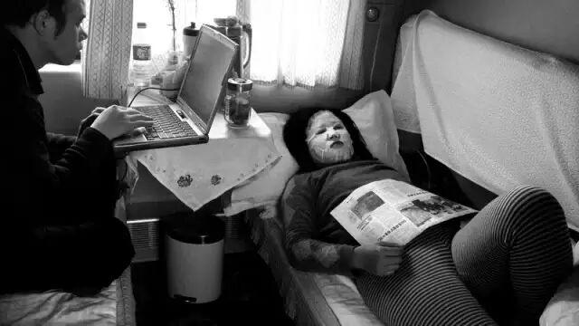 2007年,北京到拉萨的列车上,一位女子躺着做面膜,另一位男人则在玩电脑。
