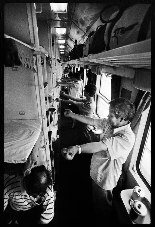 1999年,从北京开往乌鲁木齐的列车上,卧铺车厢的过道里站满了做运动锻炼身体的人们。