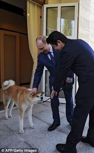 普京曾带着2岁大的小梦在门外迎接安倍,但小梦可能是因为被记者团和闪光灯吓到,显得焦躁不安,被安倍轻抚几下后更迅速逃回屋内。有媒体称,连“强人”普京也拿性格倔强的小梦没办法。安倍啊,你咋连狗缘都这么差。