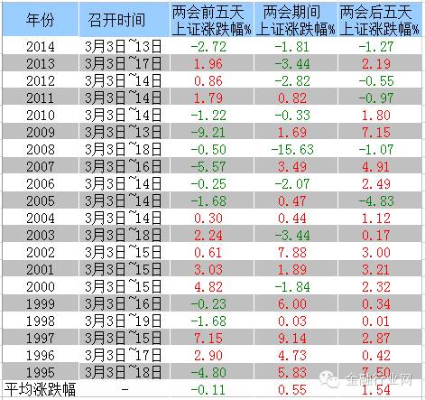 从最近20年以来两会上证的涨跌幅来看,在两会结束后5个交易日沪指上涨次数达15次,下跌次数5次,上涨概率是75%,平均涨幅为1.54%,两会前5个交易日沪指上涨10次,概率50%,平均涨幅-0.11%,两会期间沪指上涨12次,概率是60%,平均涨幅0.55%。