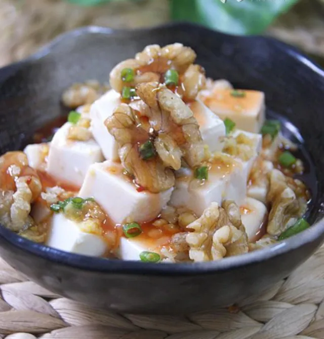 做法 1.主材料备好;2.核桃分为两部分,一部分保留原状,另一部分用擀面杖压碎,咸蛋黄用勺子压碎,香葱切花备用;3.豆腐切成整齐的方块摆入碗中;4.将剁碎的咸蛋黄撒在豆腐块上,淋上甜辣酱,撒上核桃和香葱花点缀即可。
