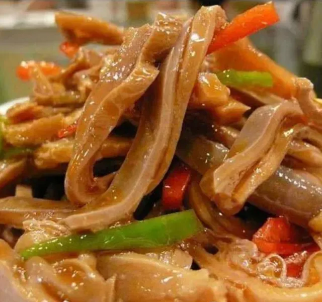 做法:猪肚煮熟放凉后切成6厘米长的细丝,与各种配料丝混合,另将蒜茸、红油等调料制成的味汁倒入拌匀,撒上白芝麻、香菜装盘即可。色泽光亮,咸鲜香辣,柔嫩爽脆。