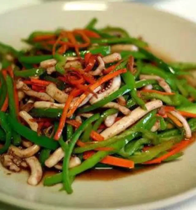 做法:1、鱿鱼去内脏洗净,切丝。青椒,胡萝卜,姜切丝;2、锅热入油,倒入姜丝后倒入鱿鱼丝翻炒,调入生抽,翻炒几个来回后,倒入青椒,胡萝卜丝,调入盐翻炒;3、炒匀后即可装盘~很简单的家常菜哦~