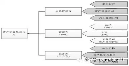 资产证券化是一个系统的融资设计,需要多方的参与。通用的结构包括三大部分,原始权益方、管理方、服务方。一般情况下,在本文中,原始权益方指拥有贷款资产或资产池(即基础资产)的银行及类似金融机构。管理方指充当特殊目的载体(Special Purpose Vehicle,SPV)的信托及相关机构(包括投行等)。而服务方则包括为资产证券化提供相关服务的资产托管方、资产评估机构、律师事务所、信用评级机构、担保方、会计师事务所等相关中介服务机构。下面我们将依次介绍这些机构在整个资产证券化中的作用以及对于改善资产证券化融资所能做的改善措施。