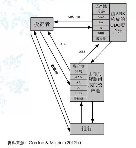 美国资产证券化普遍存在重复证券化的问题。重复证券化拉长了资金的中介链条,加剧了信息不对称。Gorton & Metric(2012b)指出,ABS一般有三种用途:一是被出售给最终投资者;二是再次证券化为CDO;三是发起人保留部分股权级证券,再购买一部分ABS用作金融交易的担保品。