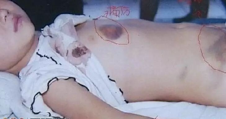 在最后一次进行更加残酷的虐待之后,这个小女孩走完了她最后的人生!只有七岁,七岁啊。(更具体的说是只有六岁) 在被送到平顺县人民医院的病房里时,所有的医生、护士,都潸然落泪,她已经走了,走时面部带着微笑的表情。好像是要告诉我们:我终于不疼了,我可以离开这个让我害怕的世界了。 她的亲妈赶到时,看着自己的孩子欲哭无泪,心疼吗,早做什么了,为什么?在通过了系统,进行尸检时,让法医无语。孩子的胃里竟然,没有一粒米,肠子穿孔三个洞,全身淤青没有一点好的皮肤,两只瘦弱小手被开水烫过一样,通红胀肿,流着血水,肚子上有被踢过的痕迹。在场的人,都惊呆了,震惊啊,愤怒啊,可恶啊。