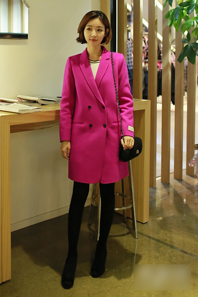 玫红色大衣采用经典的小西装设计,精致的翻领和双排扣,穿出知性干练的气质,简约的直筒版型,轻盈显瘦,娇艳的玫红色穿出妩媚柔情。